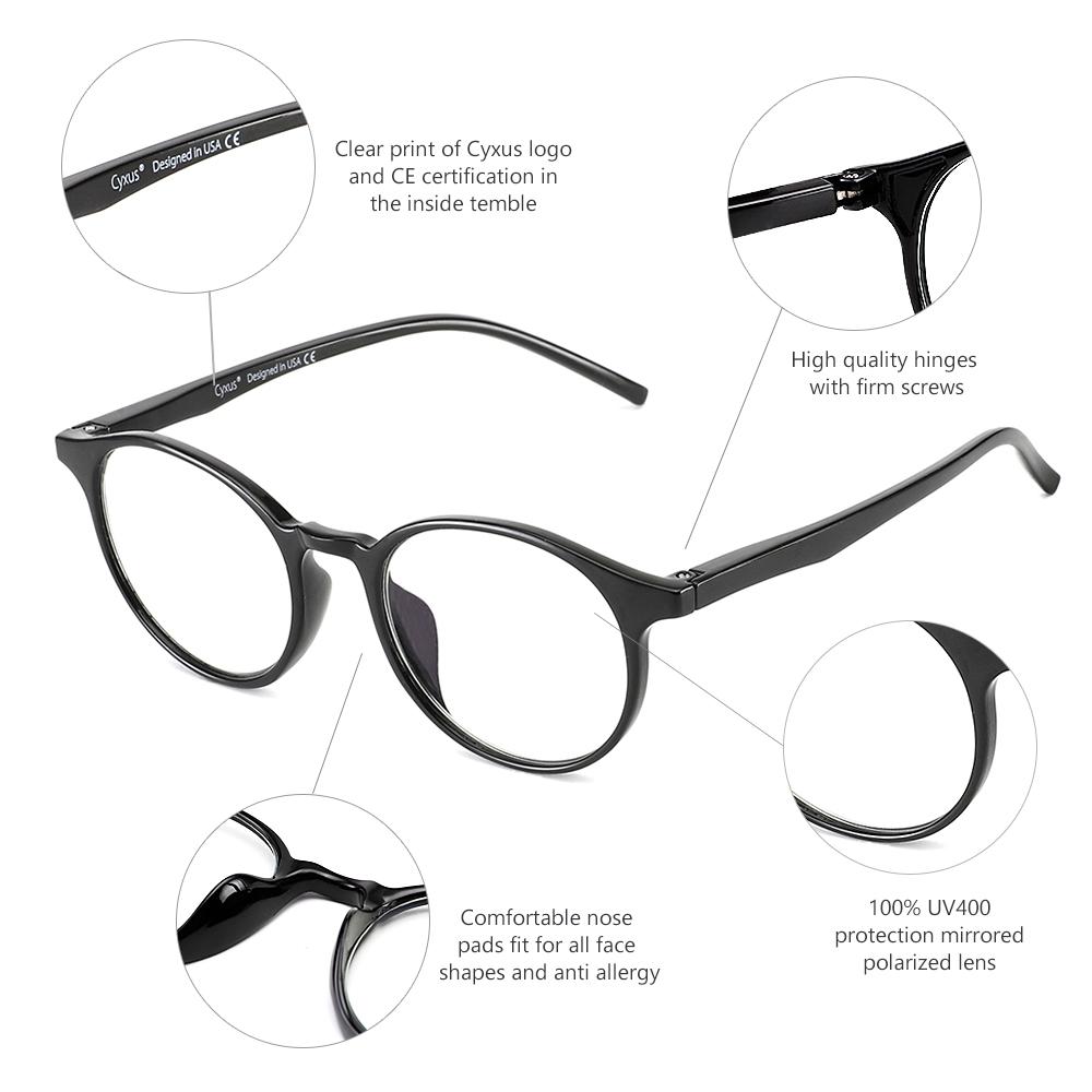 Cyxus Blue light Filter Computer Glasses 8062, these stylish mid-width, full-edge, round computer glasses (clear lenses) have a hand-polished PC frame with a shiny front surface. Classic style, suitable for all people. Reduce eye fatigue, headaches, blurred vision and dry eyes, enhancing your sleep and health.